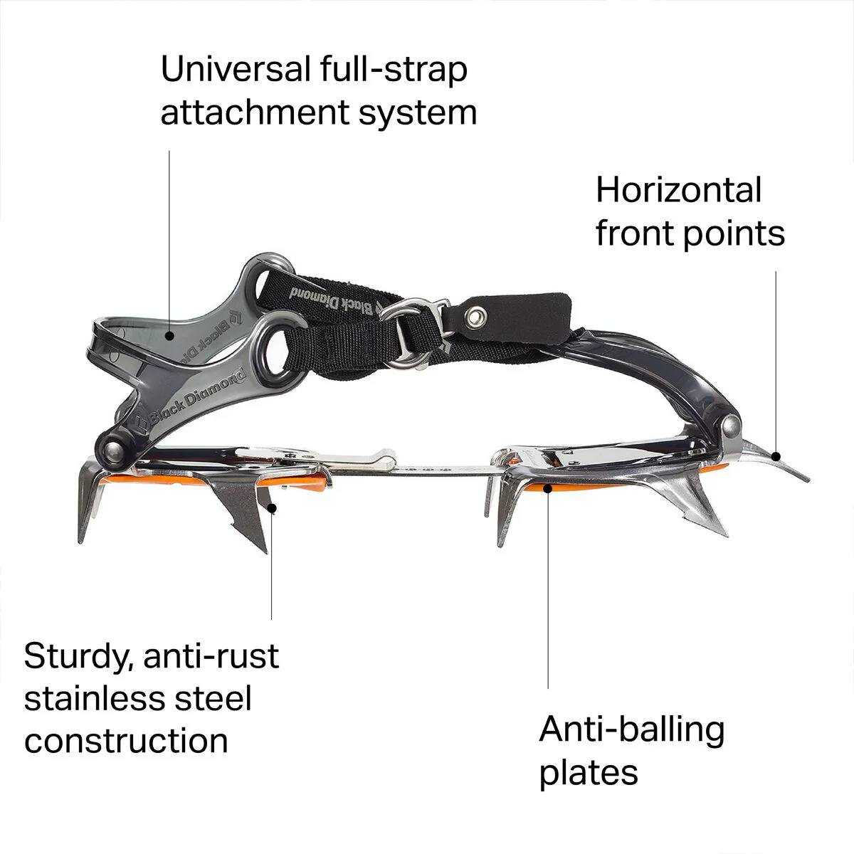 These stainless-steel crampons are built to resist rust and shedding coatings while delivering stable traction on snow and ice. The strap-on design fits most footwear, making them a go-to choice for mountaineers, skiers, and backcountry travelers.